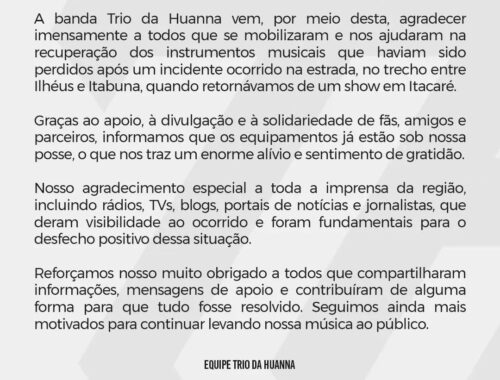 Trio da Huanna agradece mobilização e confirma recuperação dos instrumentos