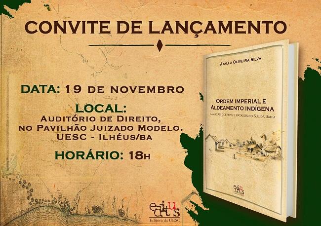 A autora Ayalla Oliveira Silva lança, nesta segunda-feira (19), aqui na UESC, seu livro “Ordem imperial e aldeamento indígena: Camacãs, Gueréns e Pataxós do Sul da Bahia”, resultado de uma longa pesquisa sobre o tema. O evento vai ser no Auditório de Direito, no Pavilhão Juizado Modelo, às 18h, integrando a programação XXIX Ciclo de Estudos Históricos. Sintam-se todos convidados!