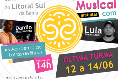 A última turma da Oficina de Composição Musical oferece, gratuitamente, 20 vagas para interessados em aprimorar a arte de criar músicas. As aulas acontecerão na Academia de Letras de Ilhéus, de 12 a 14 de junho, sempre de 14h às 17h, com facilitação dos oficineiros Danilo Nascimento e Lula Soares Lopes.