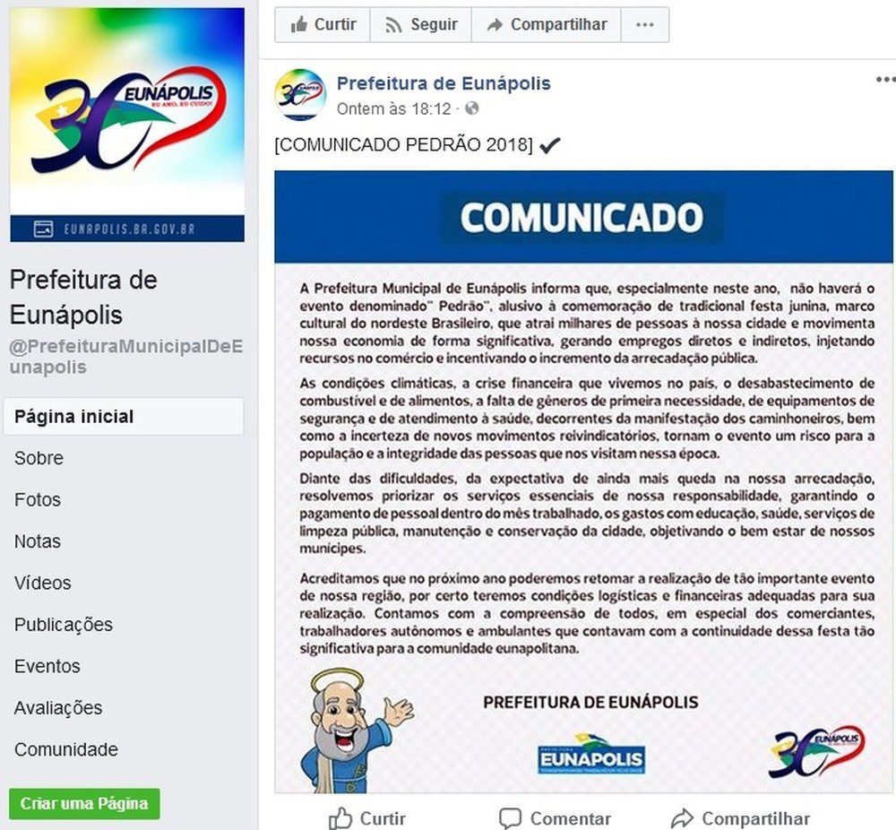 “As condições climáticas, a crise financeira que vivemos no país, o desabastecimento de combustíveis e de alimentos, a falta de gêneros de primeira necessidade, de equipamentos de segurança e de atendimento à saúde, decorrente da manifestação de caminhoneiros, bem como a incerteza de novos movimentos reivindicatórios, tornam o evento um risco para a população e a integridade das pessoas que nos visitam nessa época”.