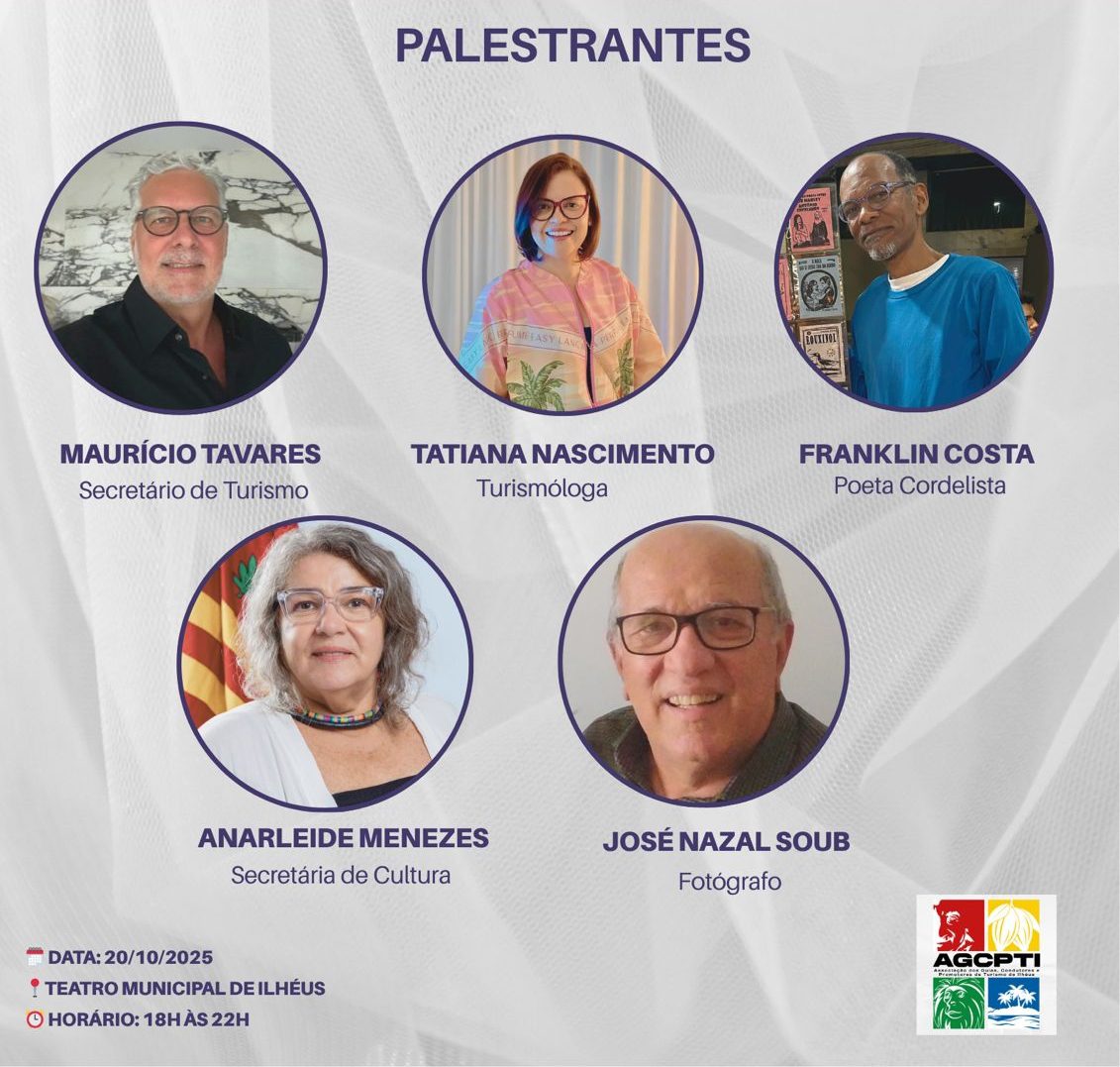 A AGCPTI promove, no dia 20 de outubro, um encontro especial no Teatro Municipal de Ilhéus, com o objetivo de propor uma reflexão sobre a importância de integrar os diversos olhares sobre a cidade — seus patrimônios, suas pessoas e suas experiências. A proposta é construir coletivamente um turismo que valorize o que Ilhéus é e o que representa.