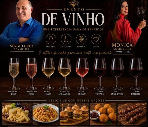 O evento será realizado a partir das 19h, no Salão de Festas do Cidadele, e contará com a presença dos sommeliers Sérgio Cruz e Mônica (Hometimes), que irão conduzir a degustação de diferentes estilos de vinhos — entre eles espumantes, brancos, rosés e tintos.