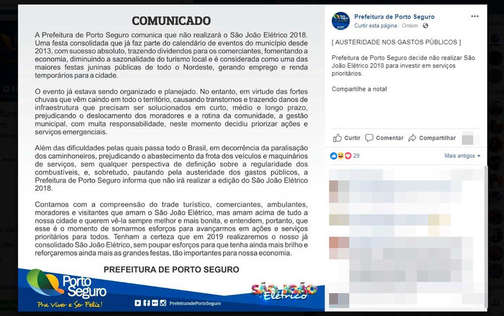 A Prefeitura Municipal de Porto Seguro, no extremo sul da Bahia, anunciou que não irá realizar esse ano o tradicional São João Elétrico, festejo junino gratuito que acontece na cidade desde 2013. O executivo municipal alegou que precisa arcar com prejuízos provocados por chuvas que atingiram a região nos últimos dias e citou ainda dificuldades em decorrência da greve dos caminhoneiros.A