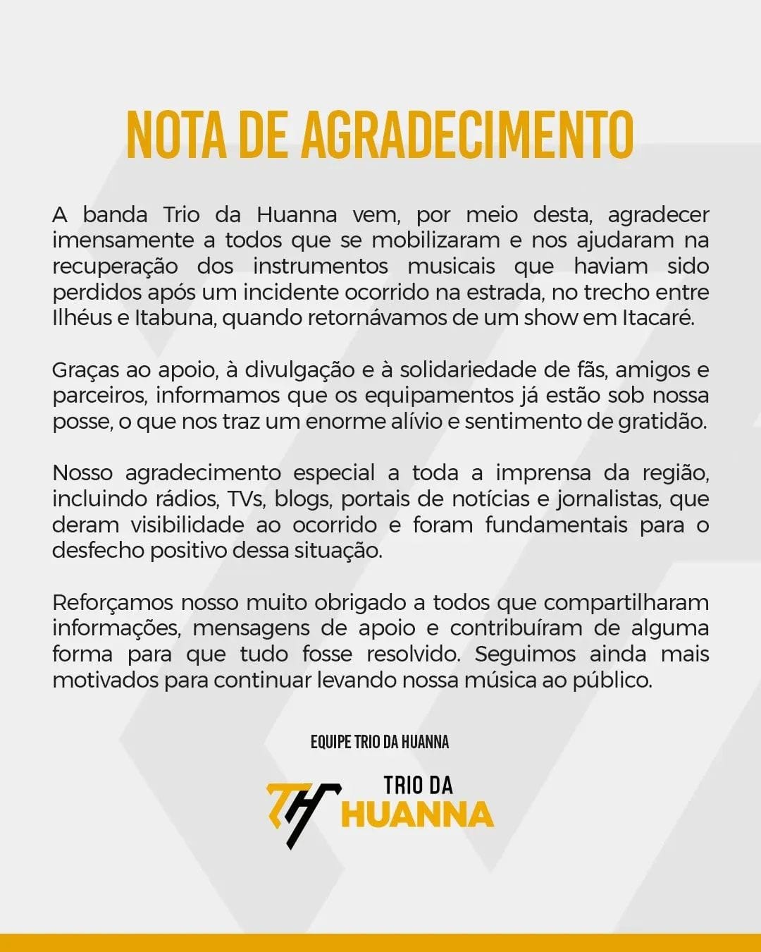 No comunicado, o grupo agradece a mobilização de fãs, amigos e parceiros que ajudaram na divulgação do caso, ocorrido no trecho entre Ilhéus e Itabuna, quando a banda retornava de um show em Itacaré. Segundo a nota, o apoio recebido foi fundamental para que os equipamentos voltassem à posse da equipe, trazendo alívio e sentimento de gratidão.