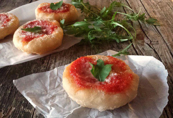 Numa frigideira grande e funda, frite as pizzas em óleo quente até que dourem levemente de ambos os lados. Retire com uma escumadeira e deixe escorrer sobre um papel toalha. Espalhe uma colherada de molho sobre cada pizza, polvilhe com queijo parmesão e decore com uma folha manjericão.