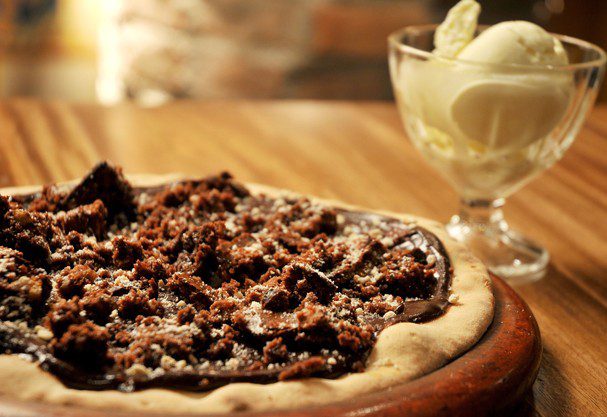Para fazer a massa, misture bem os ingredientes e bata até chegar no ponto (quando a massa se desgrudar da vasilha e não tiver quase nada de farinha no recipiente). Em seguida, abra um disco com cerca de 200g de massa, usando farinha de trigo para ajudar. Faça alguns furos na massa e leve-a ao forno para assar levemente sem nenhum ingrediente. Depois, retire-a e espalhe o creme de chocolate por toda massa, acrescentando o brownie (divida-o em pedaços pequenos) e a farofa crocante antes de levá-la novamente ao forno. Deixe por 30 segundos apenas para esquentar levemente o chocolate. Sirva o sorvete separado da pizza numa taça.