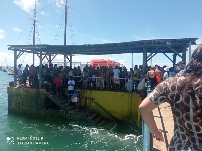 Aglomeração de turistas no terminal marítimo de Barra Grande