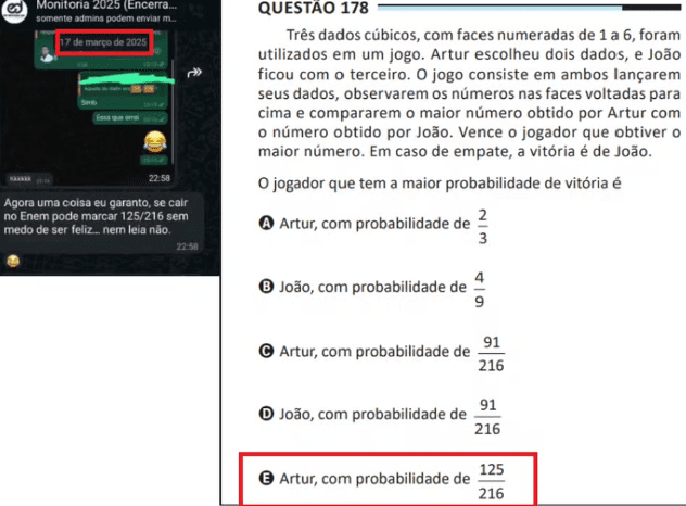 A resposta coincide exatamente com a questão de probabilidade do lançamento de dados que apareceu no Enem (questão 178 da prova azul). A alternativa correta, segundo o gabarito oficial, é justamente “125/216”.