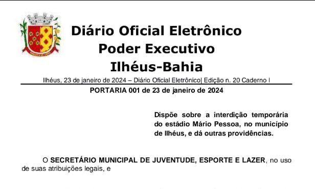 Uma decisão da Prefeitura de Ilhéus gerou um cenário de incerteza em torno dos jogos do Baianão 2024. Conforme a Portaria 001, publicada no Diário Oficial Eletrônico no dia 23 de janeiro de 2024, o Estádio Mário Pessoa foi interditado temporariamente por cinco dias devido às fortes chuvas e ao risco de acidentes. Essa medida coloca em dúvida a realização dos jogos programados para o estádio, incluindo o aguardado confronto entre o Barcelona de Ilhéus e o Vitória.