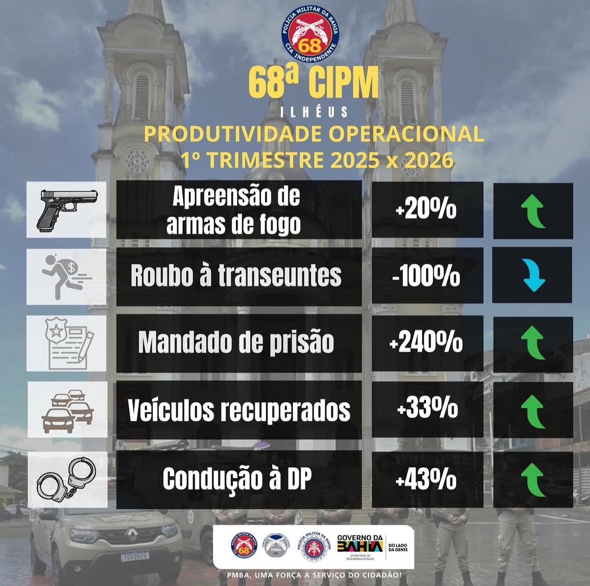A 68ª CIPM apresentou resultados positivos no comparativo entre o 1º trimestre de 2025 e 2026. Os dados apontam aumento nas apreensões de armas, no cumprimento de mandados e na recuperação de veículos.