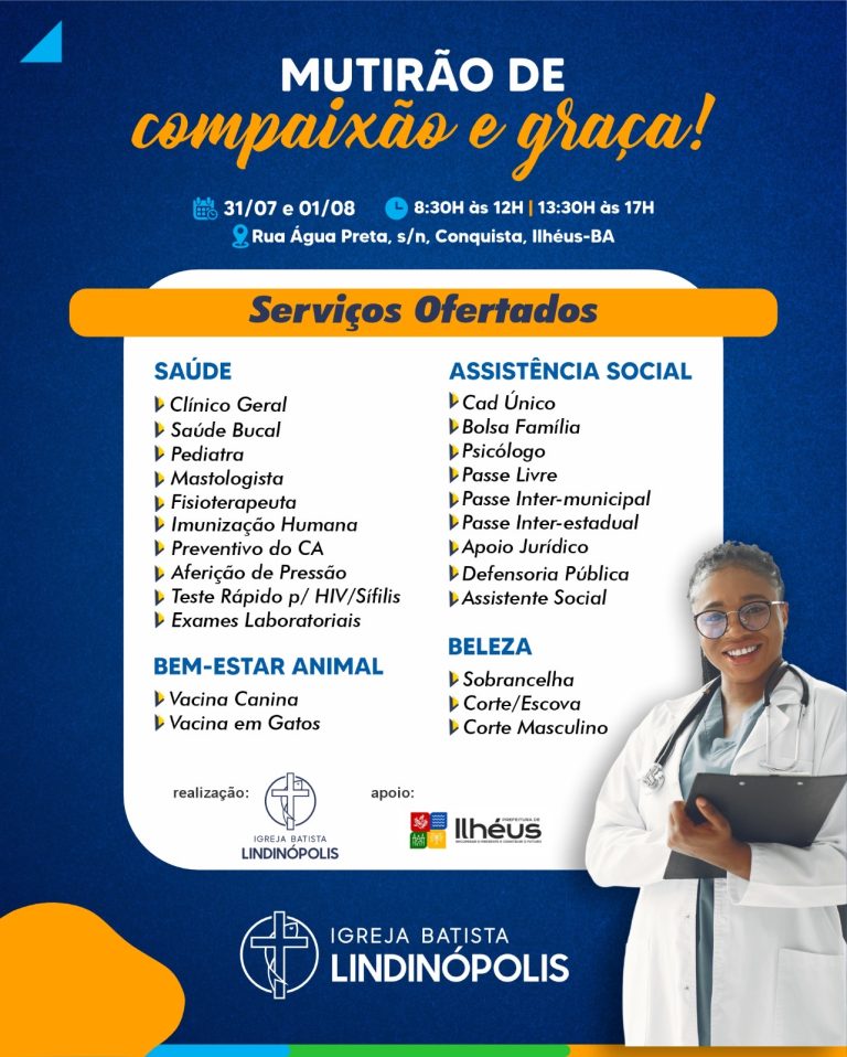 Nos dias 31 de julho e 1º de agosto, a comunidade da Conquista, em Ilhéus, será beneficiada com dois dias de serviços gratuitos voltados à saúde, cidadania, bem-estar e solidariedade. Realizado pela Igreja Batista Lindinópolis, o Mutirão de Compaixão e Graça acontece na Rua Água Preta, s/n, das 8h30 às 12h e das 13h30 às 17h, com apoio da Prefeitura de Ilhéus e da Secretaria Municipal de Saúde.