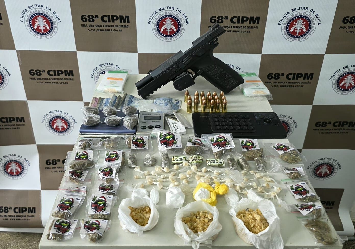 Além da arma, foram apreendidos 37 trouxas de maconha, 54 pedras de crack, seis trouxas de cocaína e três porções maiores de crack, que totalizaram cerca de 34 gramas. Também foram recolhidos um aparelho celular, uma balança de precisão, duas embalagens plásticas e R$ 17 em dinheiro.