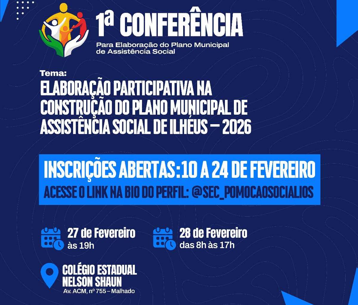 A Prefeitura de Ilhéus, por meio da Secretaria de Promoção Social e Combate à Pobreza e o Conselho Municipal de Assistência Social, promovem nos dias 27 e 28 de fevereiro a 1ª Conferência para Elaboração do Plano Municipal de Assistência Social. O encontro é aberto à população  e o objetivo é ouvir a sociedade e construir, de forma coletiva, as normas da política de assistência social do município.