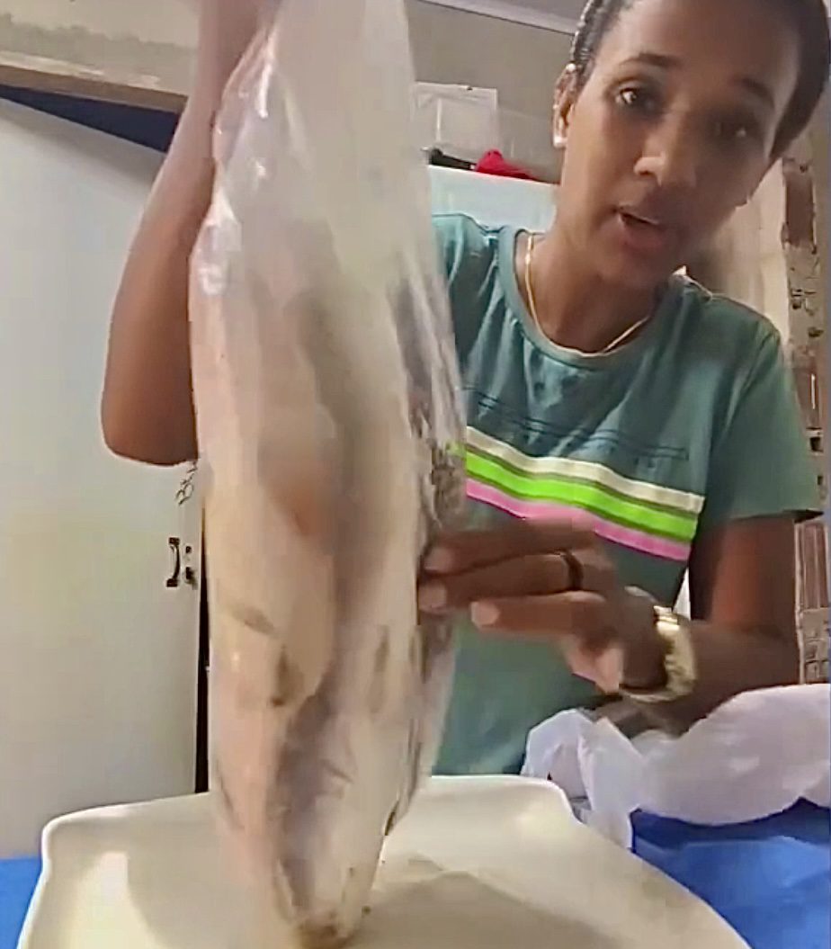 Durante o registro, ela mostra os peixes entregues e chama atenção para o tamanho. “Não é pequenininho não, viu”, comenta, enquanto apresenta o conteúdo do kit, que inclui vários alimentos tradicionais consumidos no período.