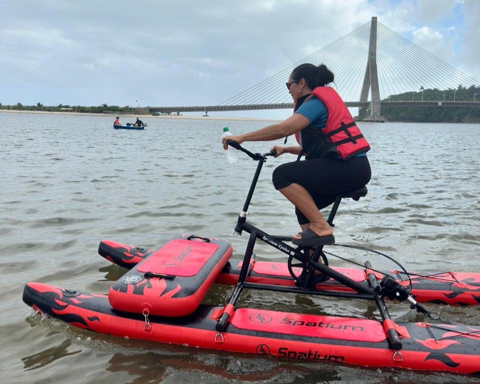 Atividade contou com uma aula funcional sobre bicicletas aquáticas; equipamentos estão disponíveis para aluguel