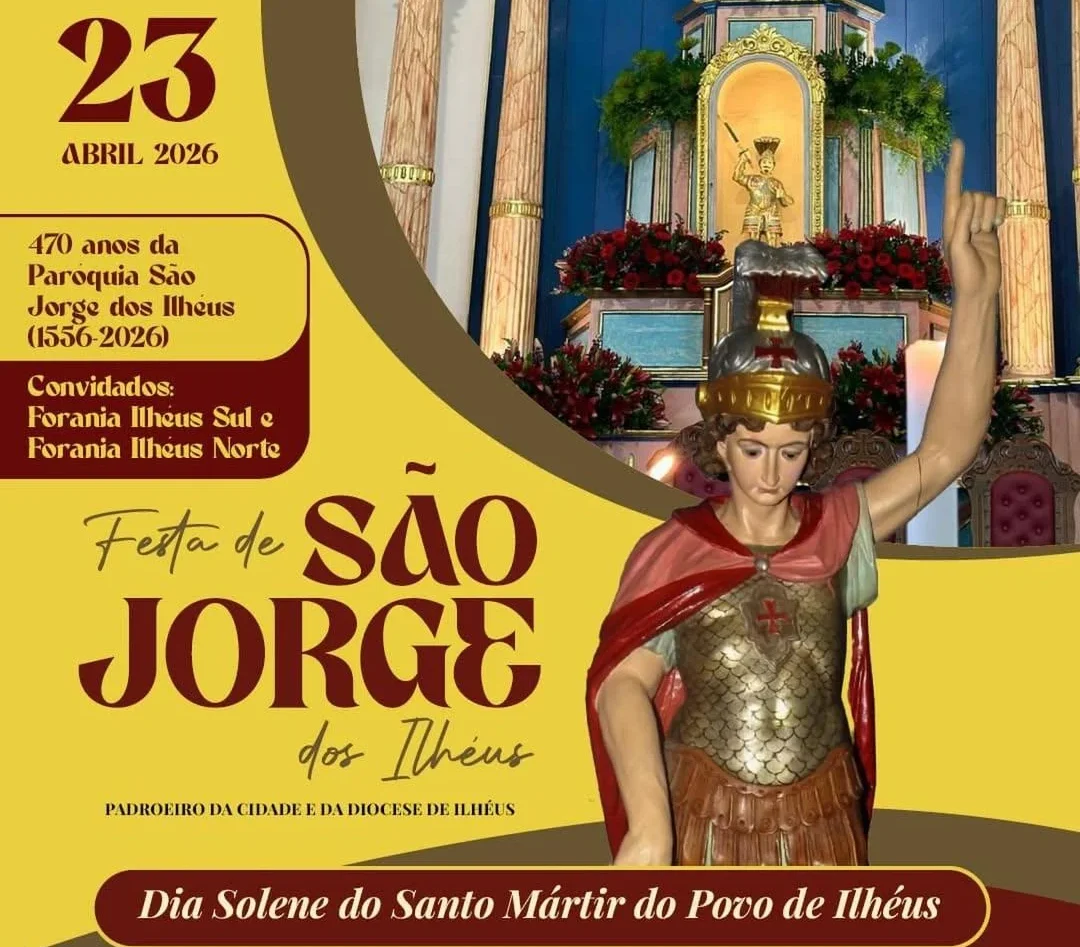 Ilhéus celebra nesta quinta-feira (23) o Dia de São Jorge, padroeiro do município e da Diocese, com uma programação especial que mobiliza fiéis ao longo de todo o dia. A data ganha ainda mais significado em 2026, quando a Paróquia São Jorge dos Ilhéus completa 470 anos de história.