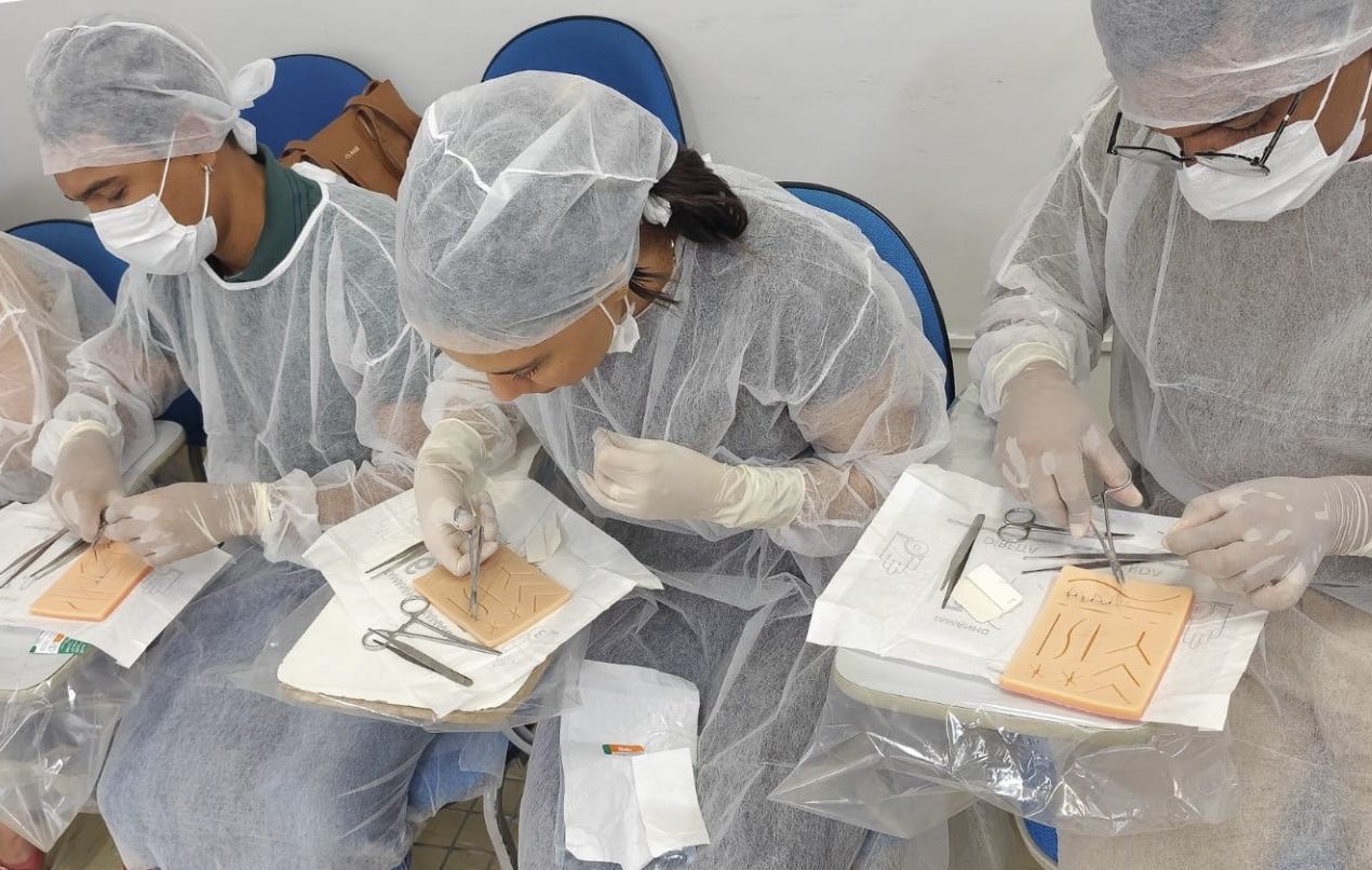 Durante a oficina, os participantes tiveram acesso a conteúdos teóricos e práticos, com foco na execução correta e segura do procedimento de sutura, seguindo critérios técnicos e éticos.