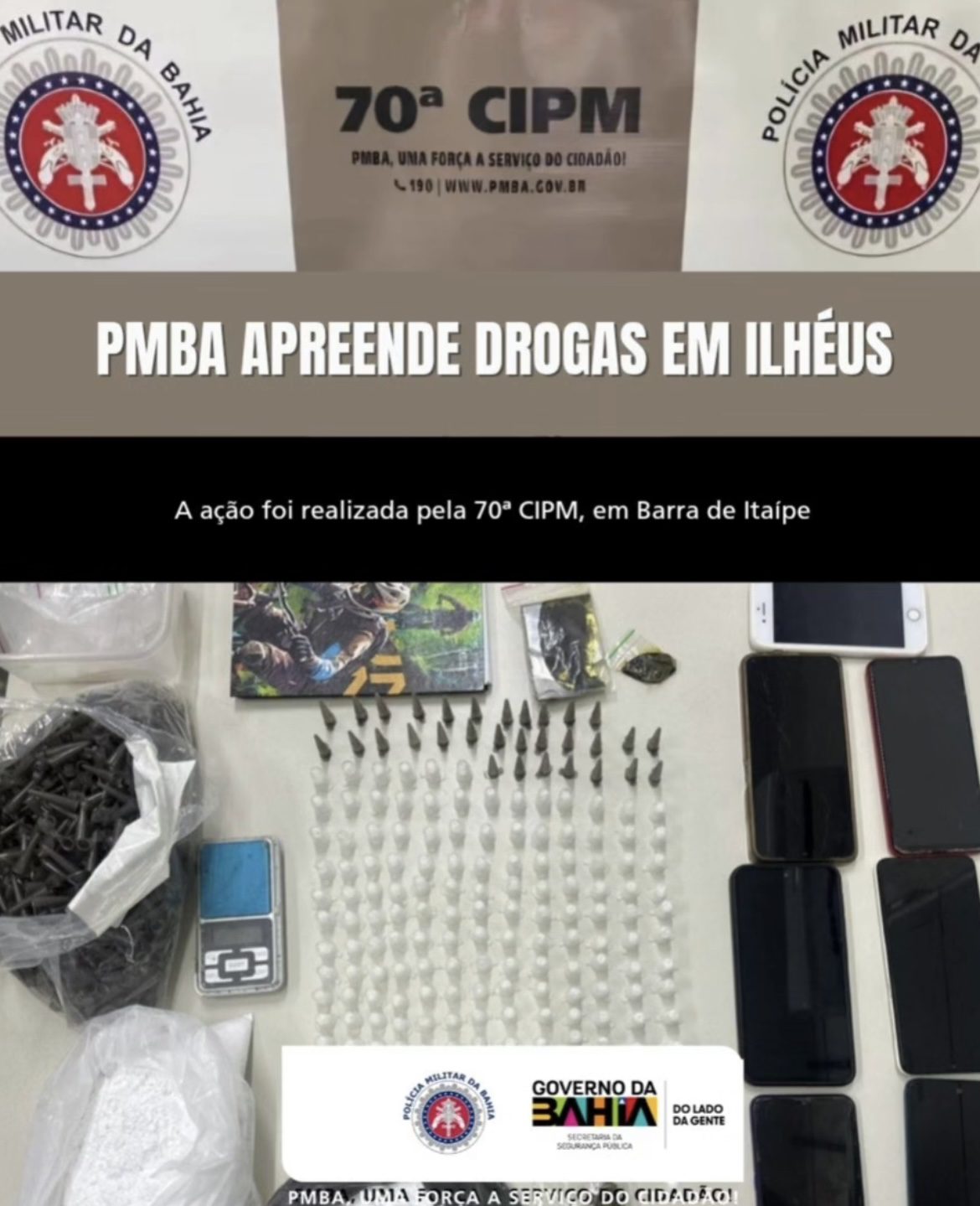 Uma ação da Polícia Militar resultou na apreensão de drogas e aparelhos celulares na tarde de sábado (21), na Rua Guanabara, bairro Barra de Itaípe, em Ilhéus.