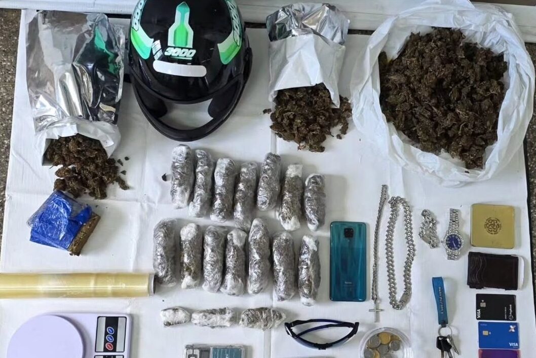 Durante a abordagem, os policiais encontraram cerca de 400 gramas de maconha, além de aproximadamente 1,4 kg da droga já fracionada. Também foram apreendidas três balanças de precisão, um celular, uma pequena quantia em dinheiro, além de objetos pessoais como correntes e um relógio.