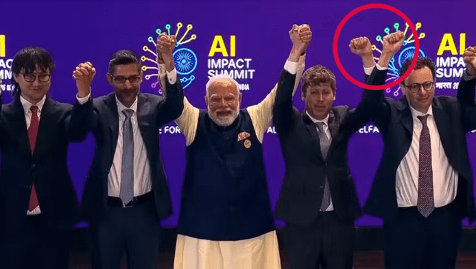 A cena ocorreu durante a Cúpula de Impacto da IA, realizada na Índia. Ao lado deles, estão Sundar Pichai (CEO do Google) e Narendra Modi, primeiro-ministro da Índia.